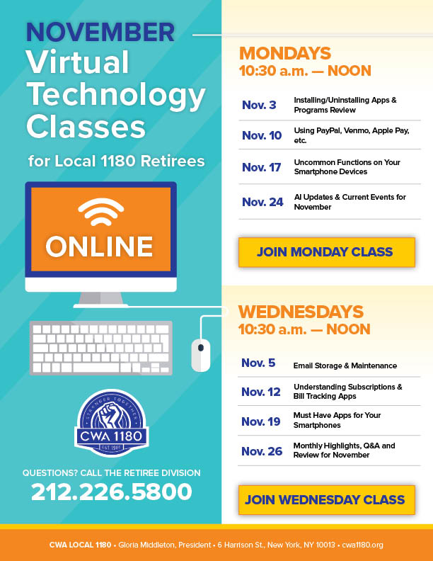 | Tues. 11/25 | IN-PERSON Review of Online Lessons / Q&A | 6 Harrison St. Call the Retiree Division to reserve your spot today: 212.226.5800 |