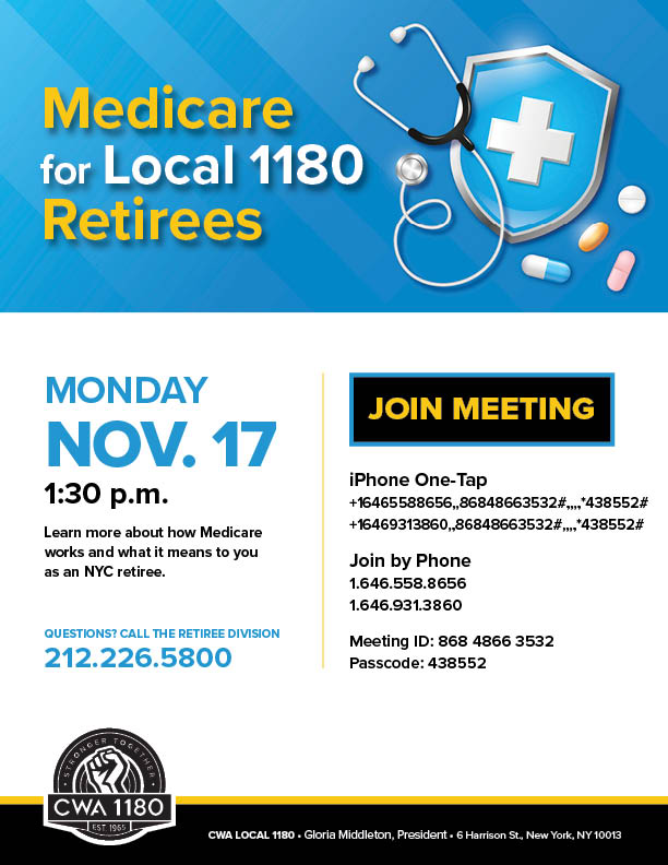 | Tues. 11/18 | Prescription Drug Plan Overview Join us for a virtual presentation to learn about the new prescription drug plan taking effect Jan. 1, 2026, for all Medicare-eligible Local 1180 retirees. | Go to zoom.com Meeting ID: 818 0460 1281 |